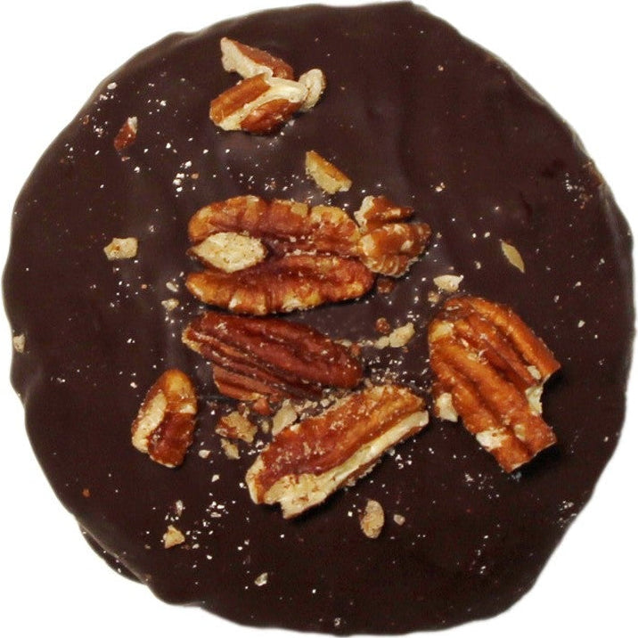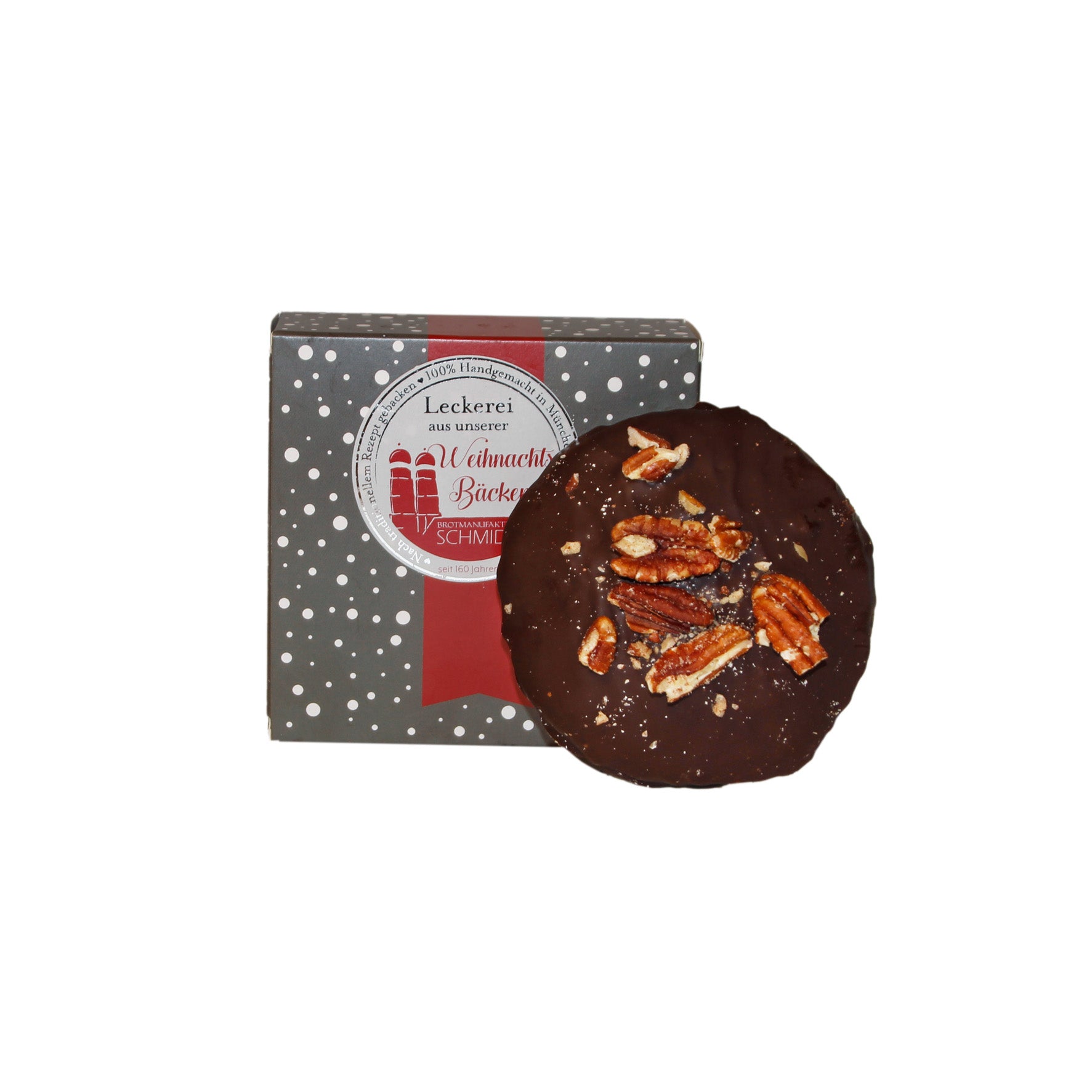 Füllung mit gerösteten Pekan-Nüssen, mit Zartbitterschokolade überzogen.